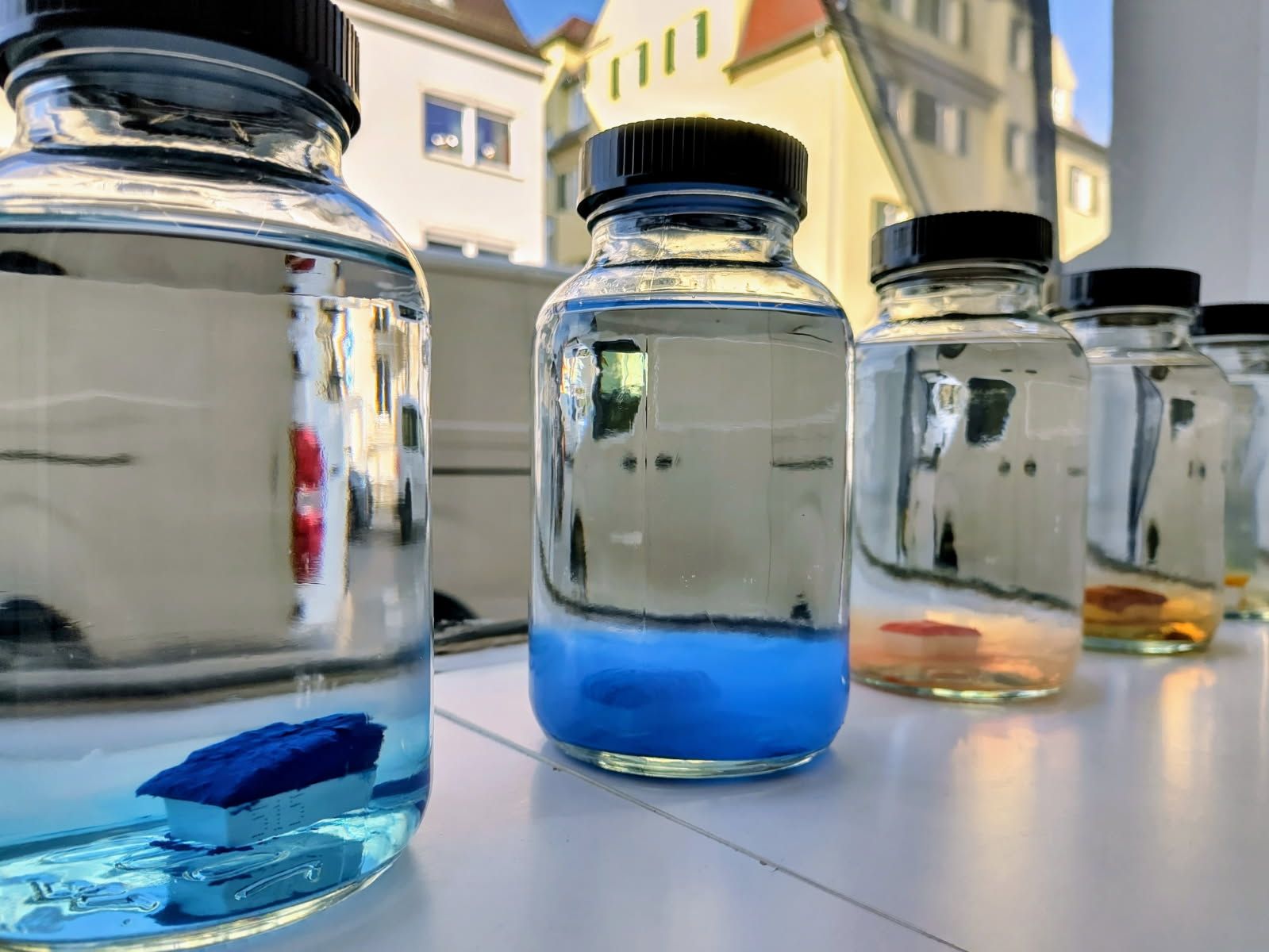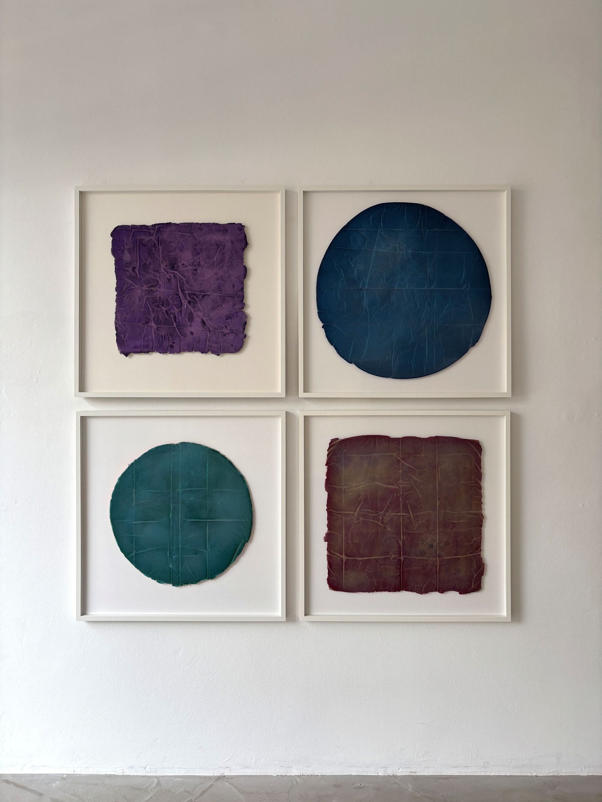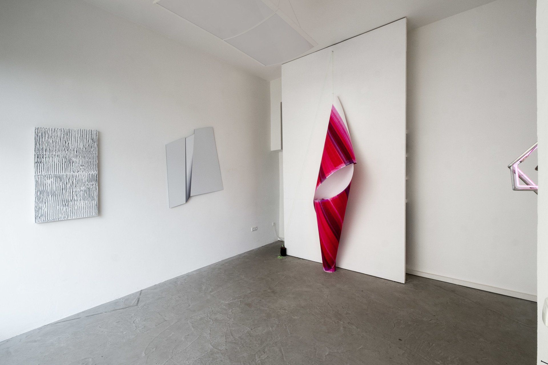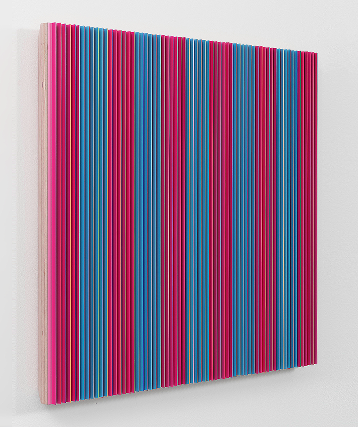 Im Abstand von der Wand angebracht und bei entsprechendem Lichteinfall, heben sich die Objekte fast schwebend vom Grund ab und unterstützten damit die imaginäre Rotation. In den Objekten der senkrecht und in leichtem Abstand addierten Streifen reflektiert die vorangegangene Farbe die folgende und beeinflusst die Qualität und Intensität des Farbereignisses.