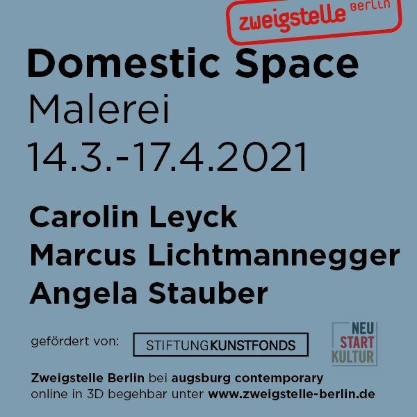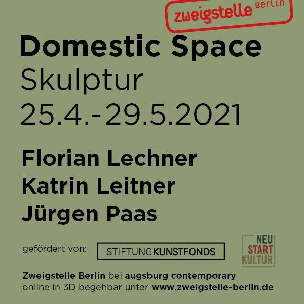 Im Rahmen des von der Beauftragten der Bundesregierung für Kultur und Medien initiierten Hilfspakets NEUSTART KULTUR schrieb die Stiftung Kunstfonds das Sonderförderprogramm 20/21 für Galerien zeitgenössischer bildender Kunst aus. Die Zweigstelle Berlin erhielt für ihr Projekt „Domestic Space“ eine Förderung. In 3 aufeinanderfolgenden Ausstellungen im Showroom der Galerie „augsburg contemporary“ wurden im 1. Halbjahr 2021 an 9 exemplarischen Beispielen aus dem umfangreichen Portfolio der Zweigstelle Berlin unter dem Titel „Domestic Space“ die Bereiche Fotografie, Malerei und Skulptur thematisiert. Hierzu wurden pro Segment 3 Künstler eingeladen, ihre Kunstwerke zu zeigen, jeweils ein Künstler pro Sparte entwickelt ein Kunstwerk / Installation speziell für diesen Raum. Gleichzeitig werden die Ausstellungen digitalisiert und somit einer breiten Öffentlichkeit vorgestellt. Projektziel war die Generierung neuer Kunstwerke durch innovative 3D Technik (Multimedia-Installation, 3D-Drucke) und die Einbeziehung des Außenraums der Galerie (Schaufenster).