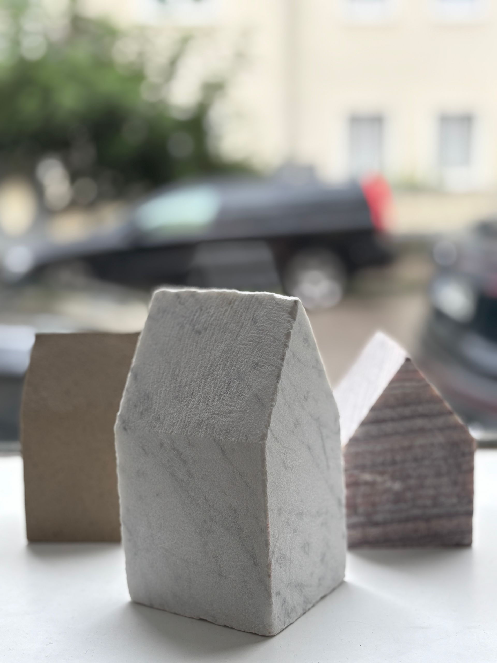 Thomas Hellinger schafft Raumbilder, die an städtische Architektur erinnern. Sie bilden jedoch keine tatsächlichen urbanen Räume ab, sondern diese entstehen erst aus den Formen heraus. Sowohl Arbeitsprozesse als auch Arbeitsergebnisse sind bei allen vier Künstler*innen sehr unterschiedlich: So wirken die Arbeiten von Spomenko rau, fast spröde, demgegenüber sind die Objekte von Balda fein, edel und leicht. Harms und Hellinger haben je ihre eigene Formensprache zwischen Chaos und Konsequenz. Die große Gemeinsamkeit aller Ausstellenden ist der Blick auf die Ursprünglichkeit des Materials und der Form mit einem radikalen Minimalismus, der mehr weglässt als addiert".
