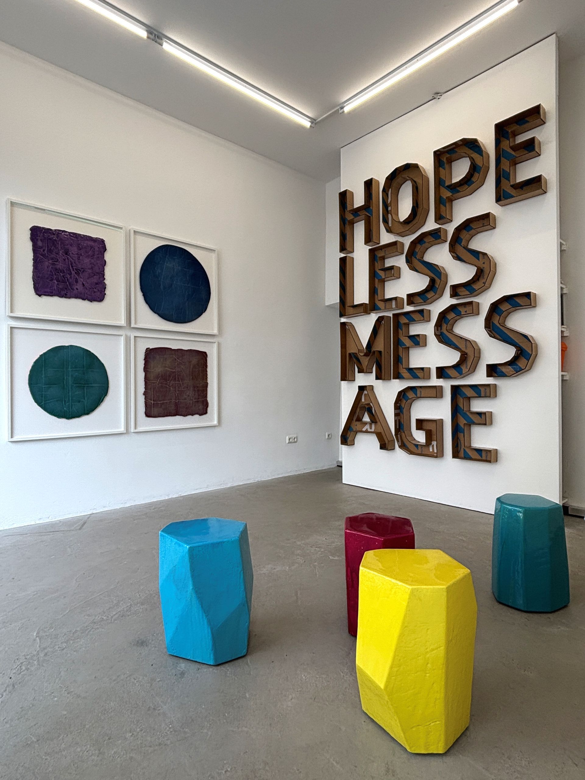 Die Kunst von Oliver Braig zeichnet sich durch einen spielerischen Umgang mit Worten, Bedeutungen und Materialien, den sinnlichen Reiz der Oberflächen und eine feine Ironie aus. Eigens für diese Ausstellung hat er Arbeiten entwickelt und auf den einen Raum bezogen, installiert. Große, nahezu dramatische Inhalte, HOPE, LESS, MESS, AGE, die sich mager in Karton formulieren und die Wand hinauf auftürmen, treffen auf high-end Oberflächen, die aussehen, als wären sie tief, aber definitiv ganz flach sind. Von mimimal art und concept art beeinflusst, macht Braig eine sinnliche Kunst, mit der er gesellschaftliche Normen und Systeme hinterfragt. Er konfrontiert die Betrachter/-innen mit überraschenden Perspektivwechseln, die ganz präzise Platz schaffen für eigene Interpretationen. Es soll ein heißer Sommer werden und die „summertime sadness“ von den Besucher/-innen sanft aber bestimmt Besitz ergreifen.