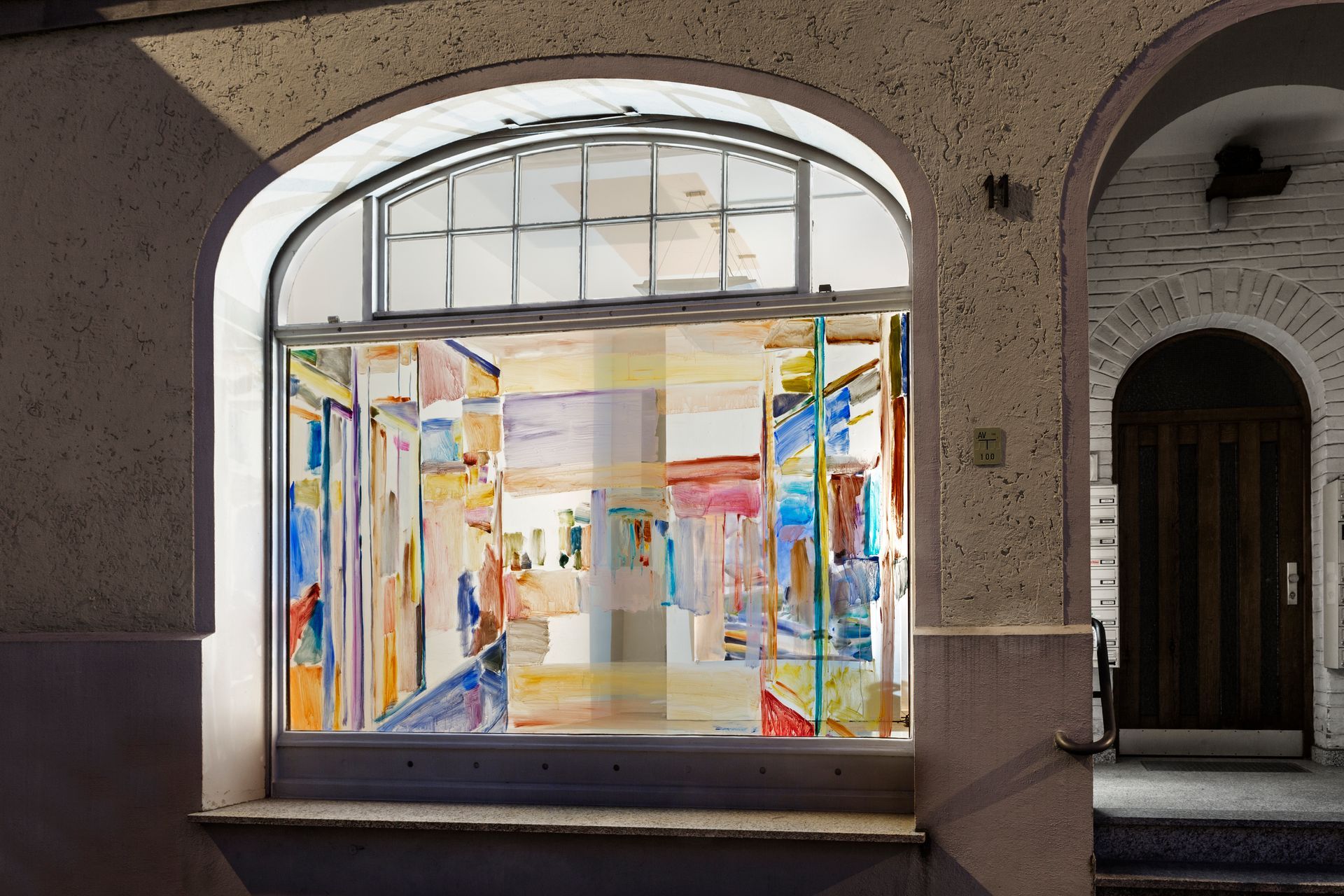 Abbildung: „Immer hier“, Fensterbild von Angela Stauber, 2021, Acryl auf Plexiglas bei augsburg contemporary. Foto: Hermann Reichenwallner