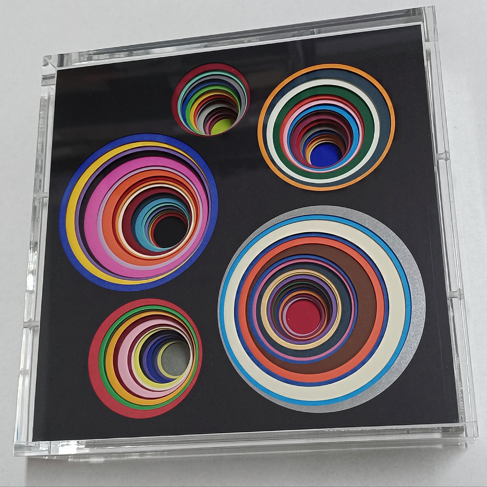 Die Arbeiten von Kirk Sora behandeln die Schönheit des Lichtes in all ihren Facetten. Durch sie werden sowohl flüchtige als auch mit bloßem Auge unsichtbare Bestandteile des weiten Lichtspektrums eingefangen, konserviert und aufbereitet. Und dauerhaft erfahrbar, auch im übertragenen Sinn sind es Lichter im Dunkeln, denen eigene Geheimnisse immanent sind. Sich auf die individuelle Suche zu begeben und diese zu ergründen, lohnt sich! | Abb.: "Drops of Nibiru", Acrylobjekte, 2024, 16 x 21 cm, in einem transparenten Acrylrahmen.
