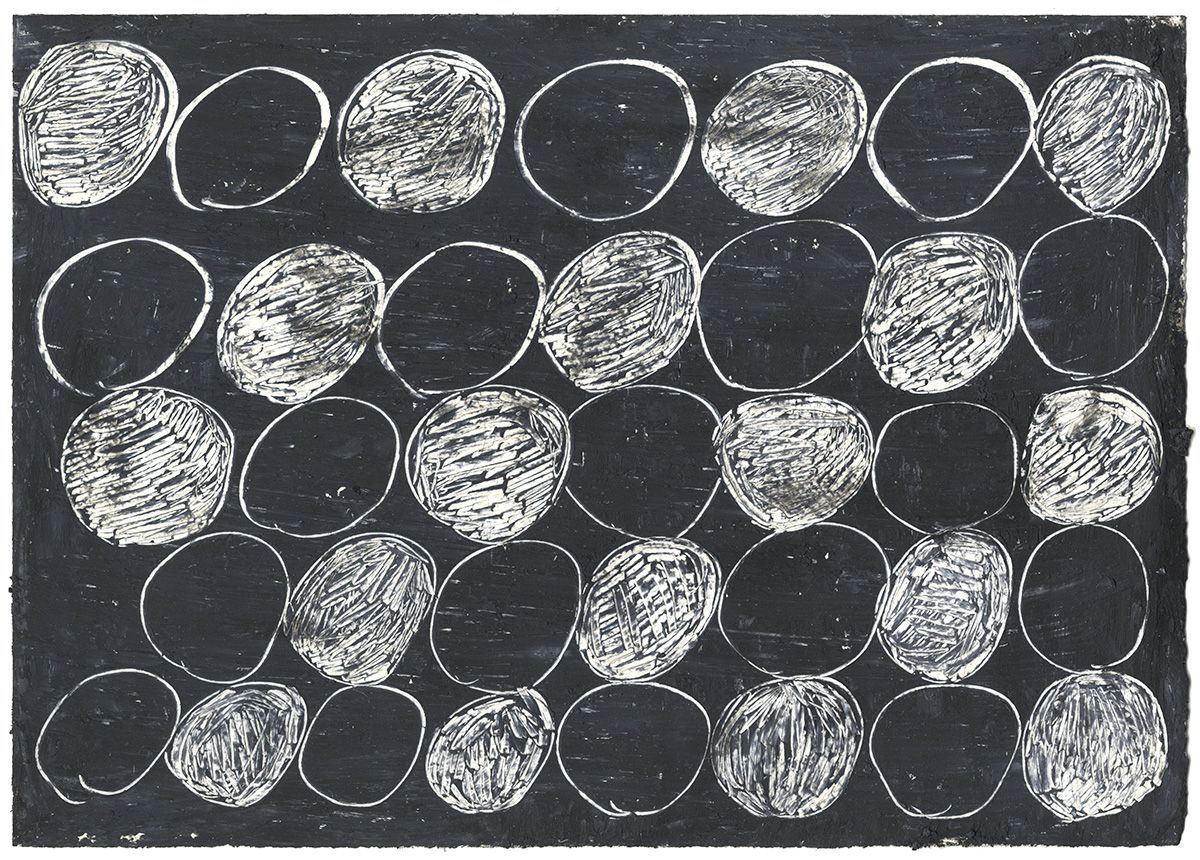 Isabelle Dyckerhoff: „Während bei meinen Leinwandarbeiten die Farbe als Material und Bildgegenstand mit ihrer räumlichen Wirkung im Vordergrund steht, gehe ich bei den seriellen Papierarbeiten zwar auf die Farbe und ihre Materialität ein, verwende aber fast ausschließlich Schwarz oder Indigo, Grautöne und Weiß − Nichtfarben also. An die Stelle der farbigen Setzungen bei den Leinwandarbeiten tritt hier die Linie als bildnerisches oder gestalterisches Element. Die Lineaturen, Zeichen, Gitter und Raster oder die Schrift sind sowohl geometrisches als auch ästhetisches Formenvokabular. | Abb.: Ölstift auf Papier, 25 x 35 cm, gerahmt